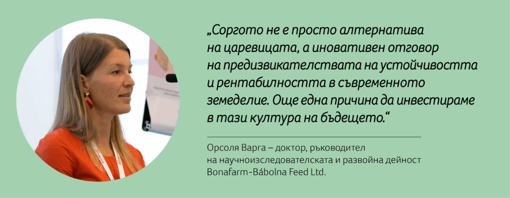 Соргото постепенно се утвърждава като нова суровина във фуража на моногастрични животни в Унгария. В презентацията си Орсоля Варга, доктор и ръководител на научноизследователската и развойна дейност в Bonafarm-Bábolna Feed Ltd., подчерта икономическите и екологичните предимства на тази култура и представи резултатите от опити в птицевъдството.