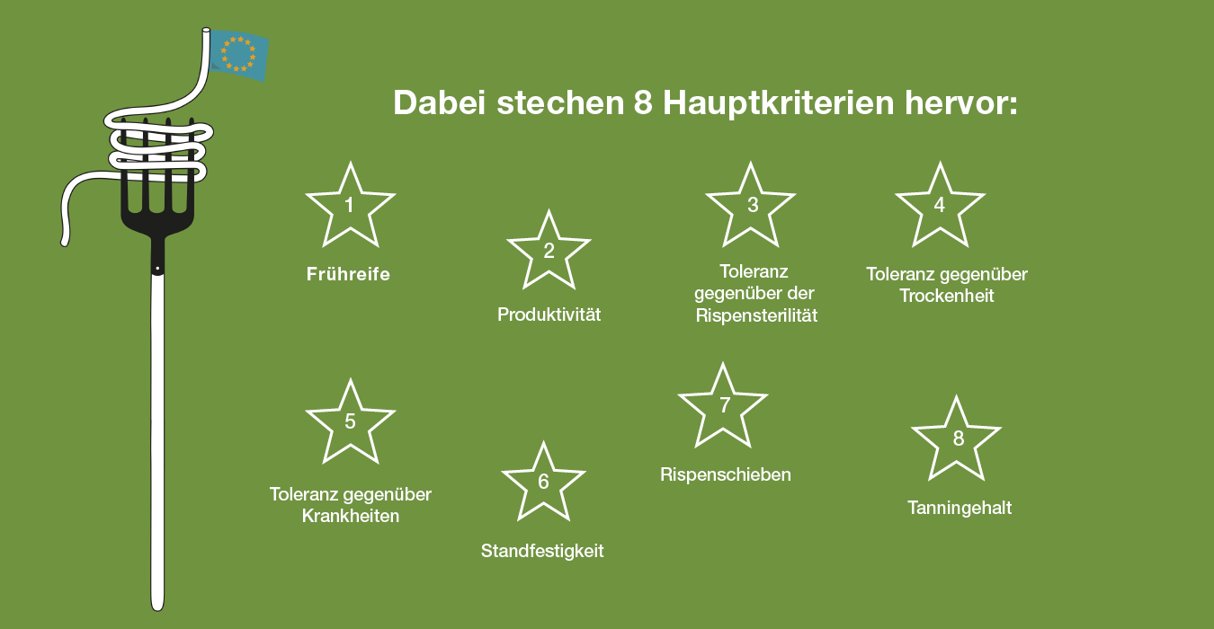 Dabei stechen 8 Hauptkriterien hervor: Frühreife, Produktivität, Toleranz gegenüber der Rispensterilität, Toleranz gegenüber Trockenheit, Toleranz gegenüber Krankheiten, Standfestigkeit, Rispenschieben, Tanningehalt.