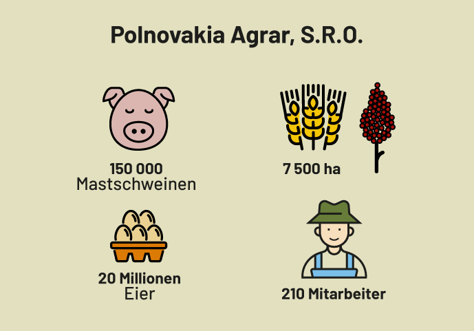 Mit 150 000 Mastschweinen jährlich ist die Schweineproduktion heute das Rückgrat des Unternehmens, das außerdem 20 Millionen Eier produziert und 7 500 ha bewirtschaftet. Polnovakia Agrar, S.R.O. beschäftigt derzeit etwa 210 Mitarbeiter. Seit 2018 hat das Unternehmen schrittweise Sorghum in seine Fruchtfolge aufgenommen.