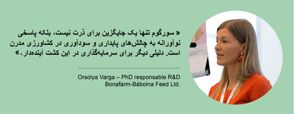 Orsolya Varga، دکتر و مسئول R&D شرکت Bonafarm-Bábolna Feed، در سخنرانی خود مزایای اقتصادی و زیست‌محیطی این کشت را شرح داد و نتایج آزمایش‌ها در پرورش طیور را ارائه کرد.