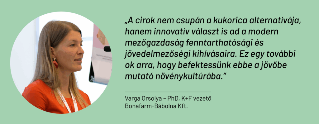 Magyarországon a cirok mint új alapanyag fokozatosan nyer teret az egygyomrú állatok takarmányozásában. Varga Orsolya, PhD, a Bonafarm-Bábolna Kft. kutatási és fejlesztési vezetője előadásában rávilágított a cirok termesztésének gazdasági és ökológiai előnyeire, és bemutatta a baromfitenyésztésben végzett kísérletek eredményeit.
