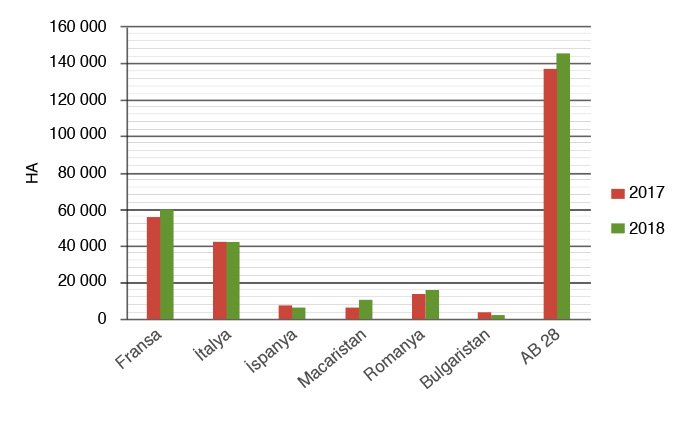 2018’de AB’de alanlar 9000 ha’lık bir artışla 145640 ha’ya ulaşarak %6’lık bir artış göstermiştir.Aşağıdaki grafikte de görüldüğü gibi, bu gelişme özellikle Romanya’da, Macaristan’da ve daha düşük ölçekte Fransa’da ve İtalya’da gözlenmektedir.