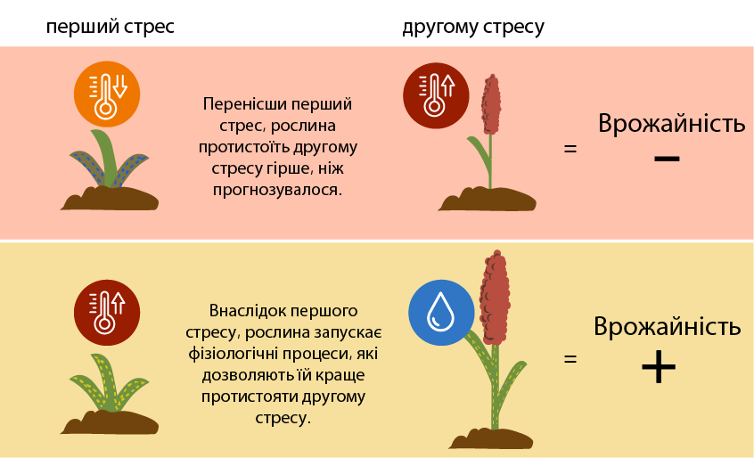 Ці два варіанти залежать від інтенсивності стресових ситуацій, їхньої тривалості, стадії розвитку рослини на момент настання стресових умов і проміжку часу між двома стресовими подіями. Крім того, трапляється, що робоча гіпотеза не підтверджується: в такому випадку, послідовність стресових подій дорівнює сумі індивідуальних ефектів кожної події.